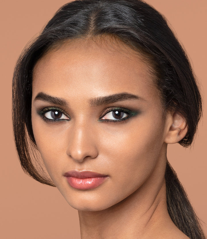 A new take on the classic kohl-rimmed eye gets a hint of texture from layered shadows in rich emerald and bronze. Flawless skin and a sophisticated neutral lip keep all the focus on the eyes.